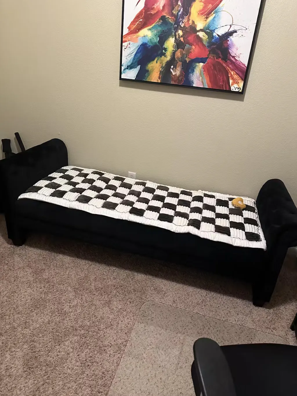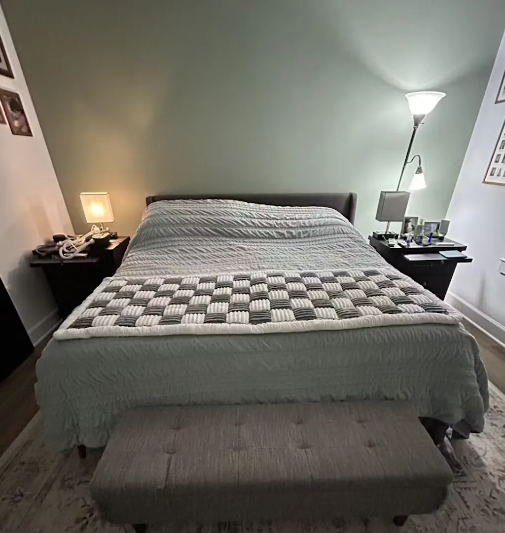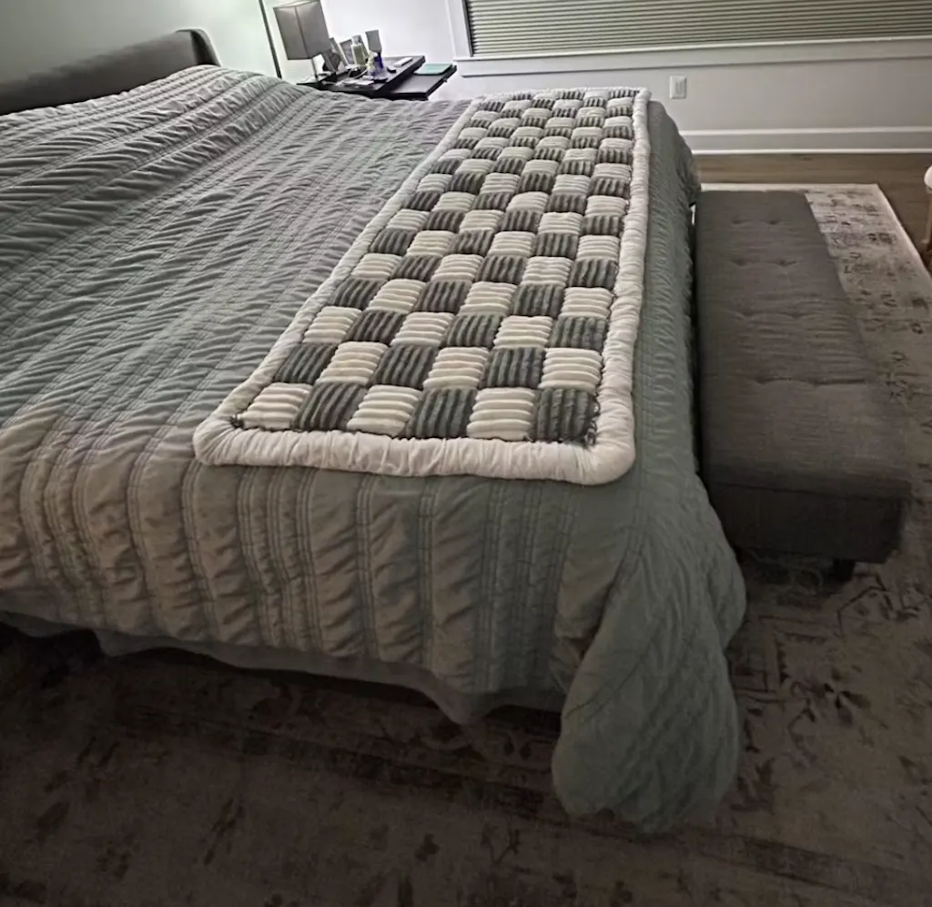 L'abbiamo messo ai piedi del nostro letto perché i nostri cani e gatti possano lì sdraiarsi. È ben fatto, morbido e accogliente. Abbiamo un letto king size e sta benissimo in fondo. Fantastico che tu possa usarlo anche per lavarlo!
