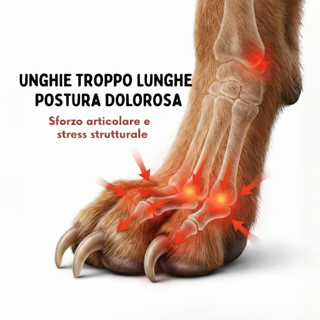 Le zampe anteriori sostengono la maggior parte del peso del corpo del cane. Per questo le unghie davanti tendono a crescere più velocemente e a subire il maggiore impatto, motivo per cui richiedono una manutenzione più frequente.